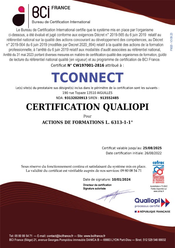 Délivrée par notre partenaire Proximity Management Institute, organisme signataire de GLC, réseau mondial dédié à l’amélioration de la qualité de l’apprentissage et de la formation, porté par IFC, filiale de la Banque Mondiale, attestant de la conformité de nos standards aux normes internationales, dont ISO 21001